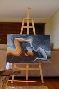 Cette œuvre représente deux âmes qui se complètent, à la fois opposées et harmonieuses, comme l’eau et le feu. Madame Roy a choisi une palette de couleurs contrastées — des bleus profonds évoquant la fluidité et la tranquillité de l’eau, mêlés à des rouges et oranges vibrants symbolisant la passion ardente du feu. Ce jeu de couleurs traduit la dualité et l’équilibre fragile entre ces deux forces. À travers cette toile, l’artiste invite à réfléchir sur la complémentarité des contraires et la beauté qui naît de leur rencontre.