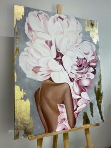 Cette peinture délicate représente une femme de dos, nue, enveloppée d’une robe légère, dont le visage est entièrement dissimulé derrière un bouquet de pivoines luxuriantes. Madame Ledroit s’est inspirée d’un moment intime et personnel : son premier rendez-vous avec son copain. Ce souvenir chargé d’émotions a donné naissance à cette œuvre poétique où la douceur des pivoines symbolise la tendresse et la timidité, tandis que la silhouette féminine incarne la vulnérabilité et la découverte de soi. En cachant le visage derrière les fleurs, l’artiste invite à ressentir l’émotion sans la fixer, laissant place à l’imaginaire et à la sensibilité de chacun.